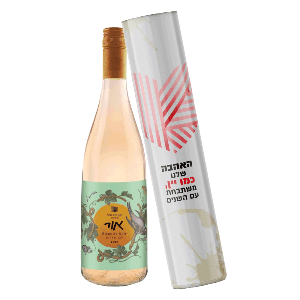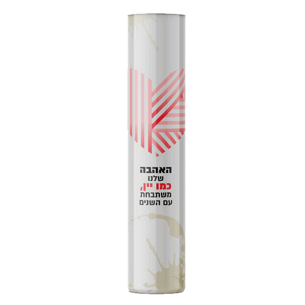 המארז כולל יין לבן לבחירה מתוך מגוון אפשרויות. היין מגיע בתוך גליל יפהפה בעיצוב מיוחד עם כיתוב "האהבה שלנו היא כמו יין, משתבחת עם השנים".