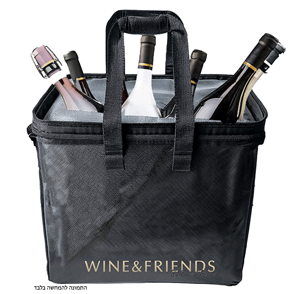 צידנית עם ארבעה בקבוקי יין שונים ממדינות שונות 750 מ"ל נפח כל בקבוק.